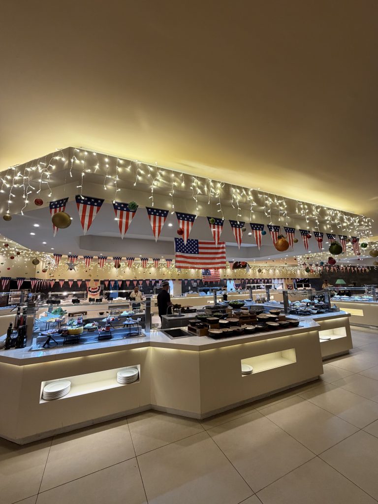 На території є багато ресторанів, серед яких один типу головний – буфет. Там щоранку можна поснідати, там же можна і пообідати, і повечеряти. Нічого мега-особливого, але є багато станцій де готують на місці. Окрім цього, є морський, стейк, японський, італійський, інтернаціональний ресторани. Суб’єктивно – морський, японський і стейк-хауз обов’язкові до відвідування, а все інше за бажанням.