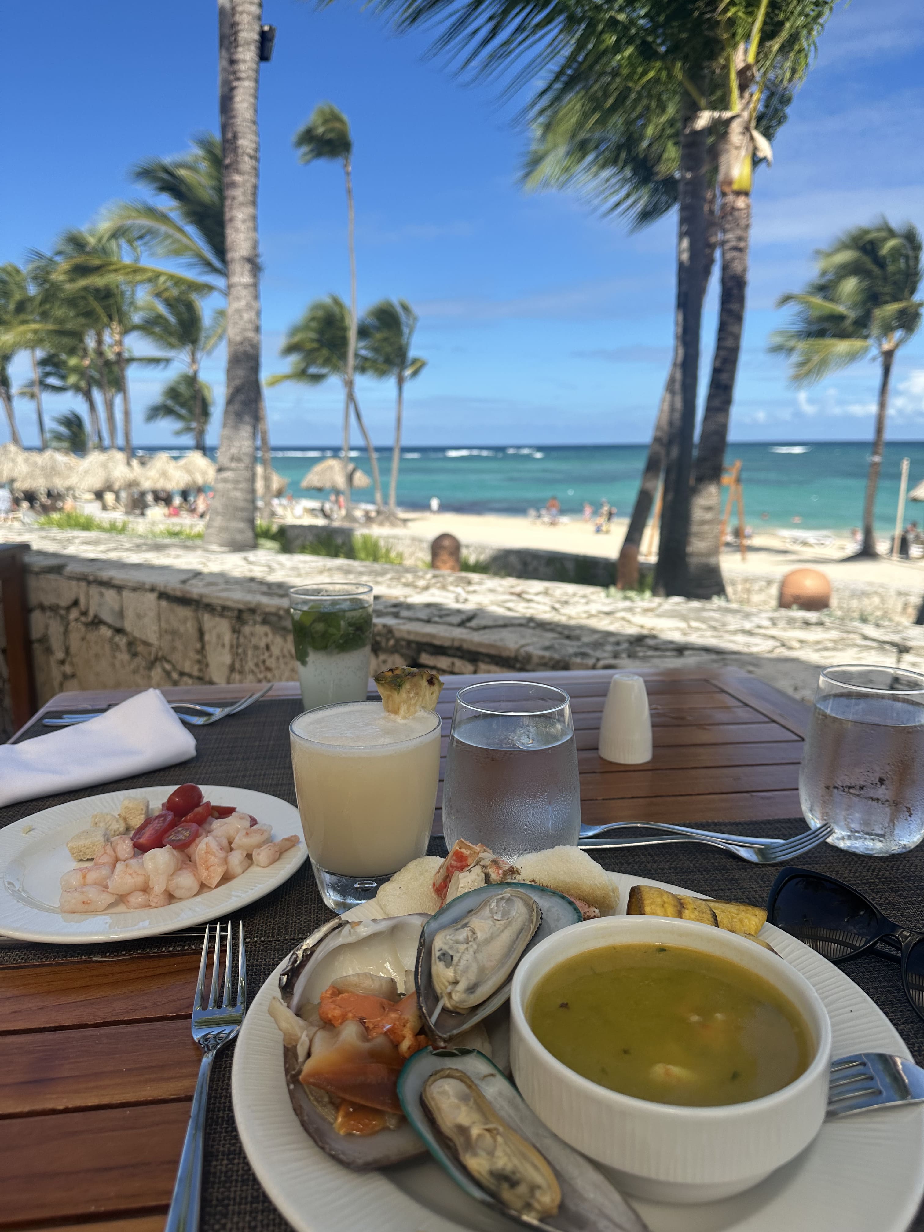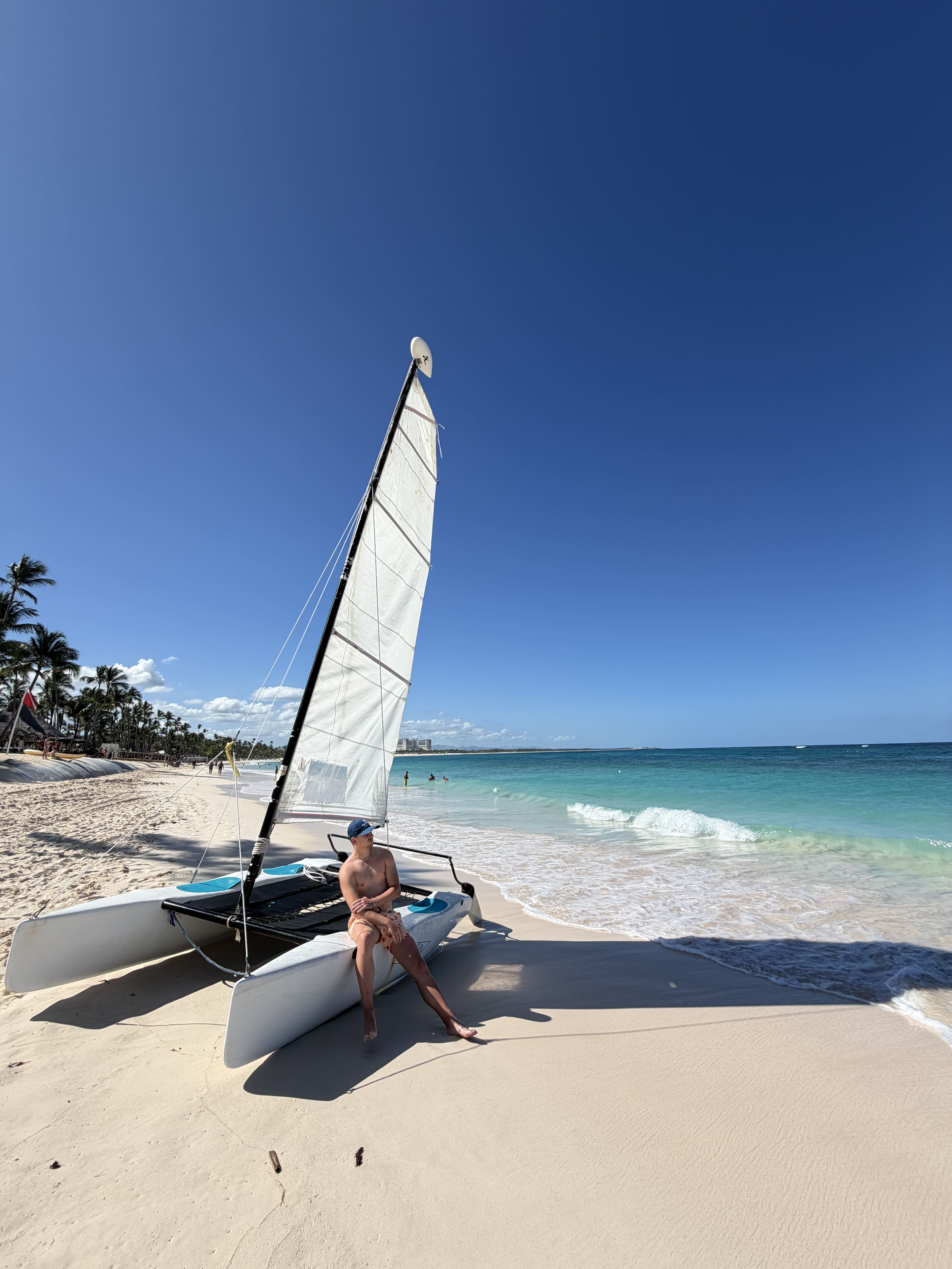 Тут все залежить від сезону, але з листопада по квітень дуже класно, бо набагато менше водоростей. По пляжу щоранку їздить трактор, який збирає все, що за ніч винесло до берега і загалом стає зручно. Пісочок білий, вода голуба. По пляжу ходять привітні домініканці, які продають різні сувеніри, сумки, і т.д. Найбільше сподобалось, що однієї відмови достатньо, щоб тебе залишили в спокої, немає нав’язливого приставання. Ну і окремо варто виділити водні види спорту. На пляжі є будка, де можна або заплатити за екскурсію, типу снорклінгу, дайвінгу чи чогось подібного (не рекомендую там брати, якщо що), або ж орендувати безкоштовно катамаран(вітрильник), каяк, чи будь-що, що є в наявності. І ось ця оренда – це одне з найкращого, що можна робити. Якщо не вмієте, то можна взяти 1 платний урок, де всього навчать і пояснять (цілком логічно).